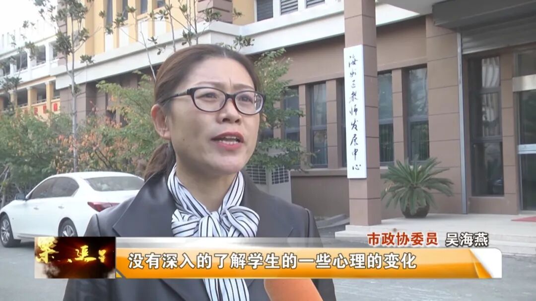 市政协委员 吴海燕:走访当中,确实也了解一些,比如说我们的家长的这种生命的意识比较淡漠,那么对孩子只要求学业的提升,没有关注学生这个孩子的心理是否健康,比如说在学校里面,也发现一些老师的这种教育的方法比较简单粗暴,没有深入的了解学生的一些心理的变化,没有及时的阻止一些可能发生的一些事情的发生。