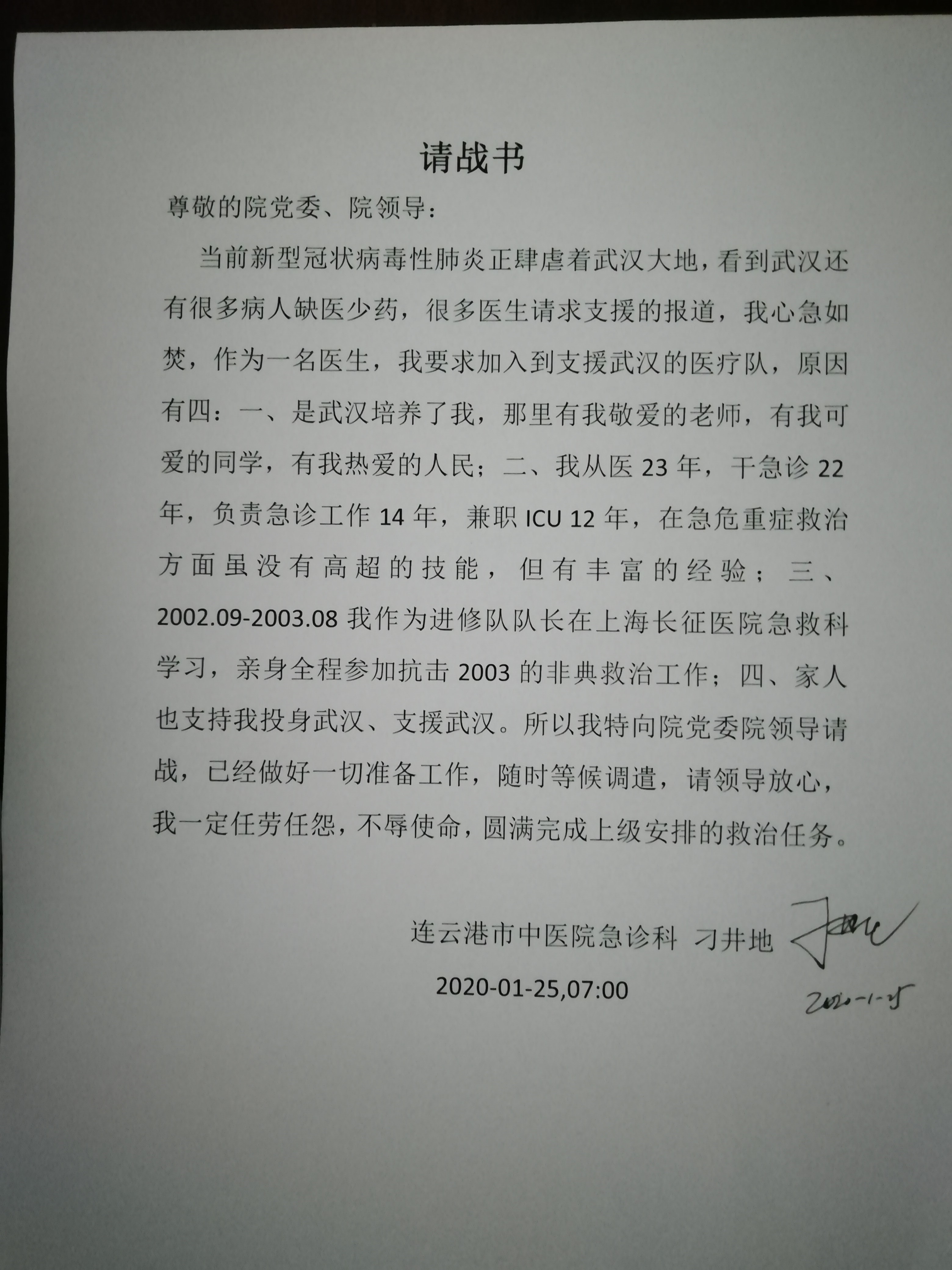 1月25日,大年初一一早,农工党党员、市中医院急诊科主任刁井地第一时间向组织上交了请战书,看到请战书后很多同事感动得泪流满面。简短而有力的誓言,显示了打赢疫情防控阻击战的信心和决心,也彰显了农工情怀。