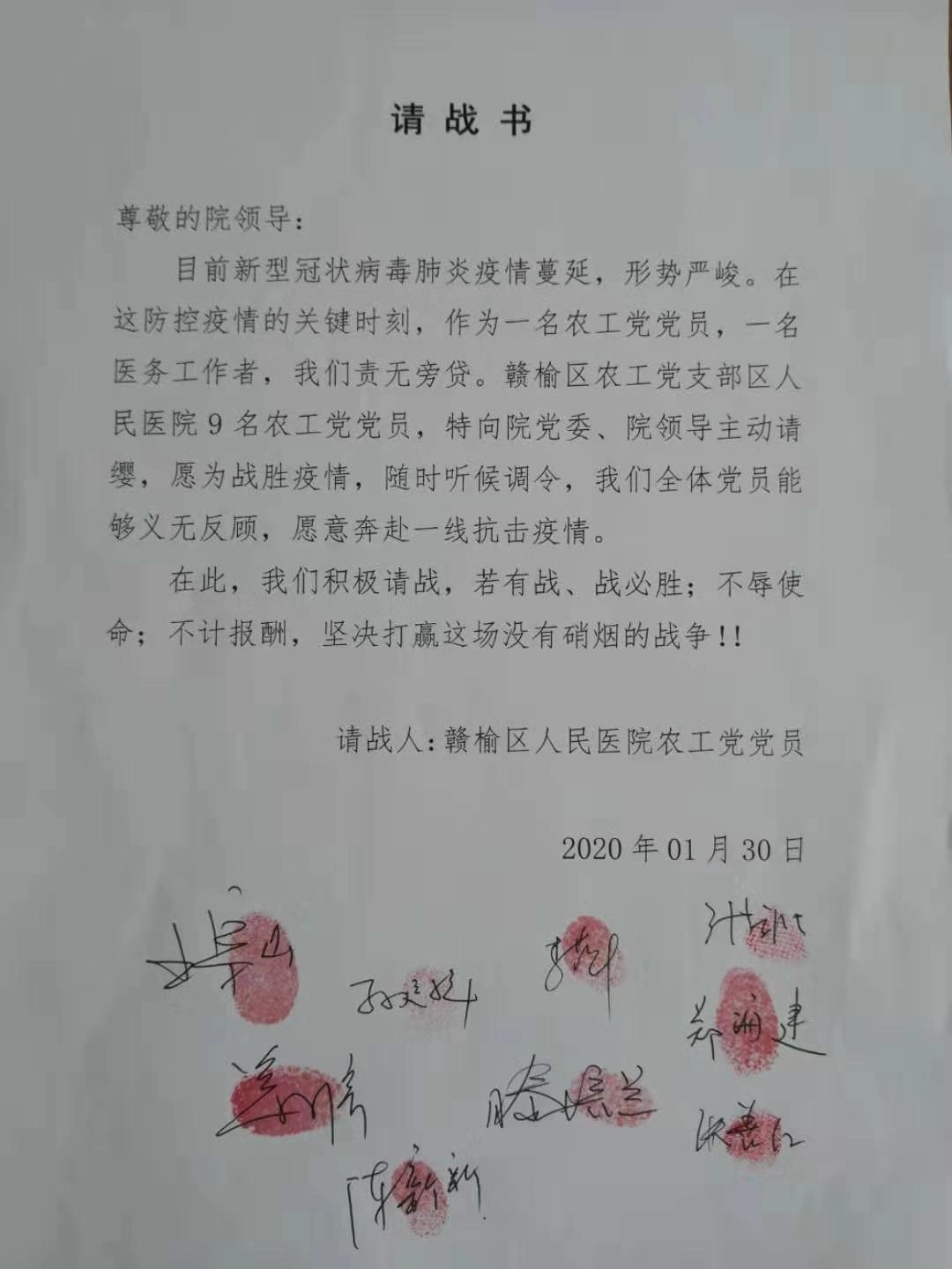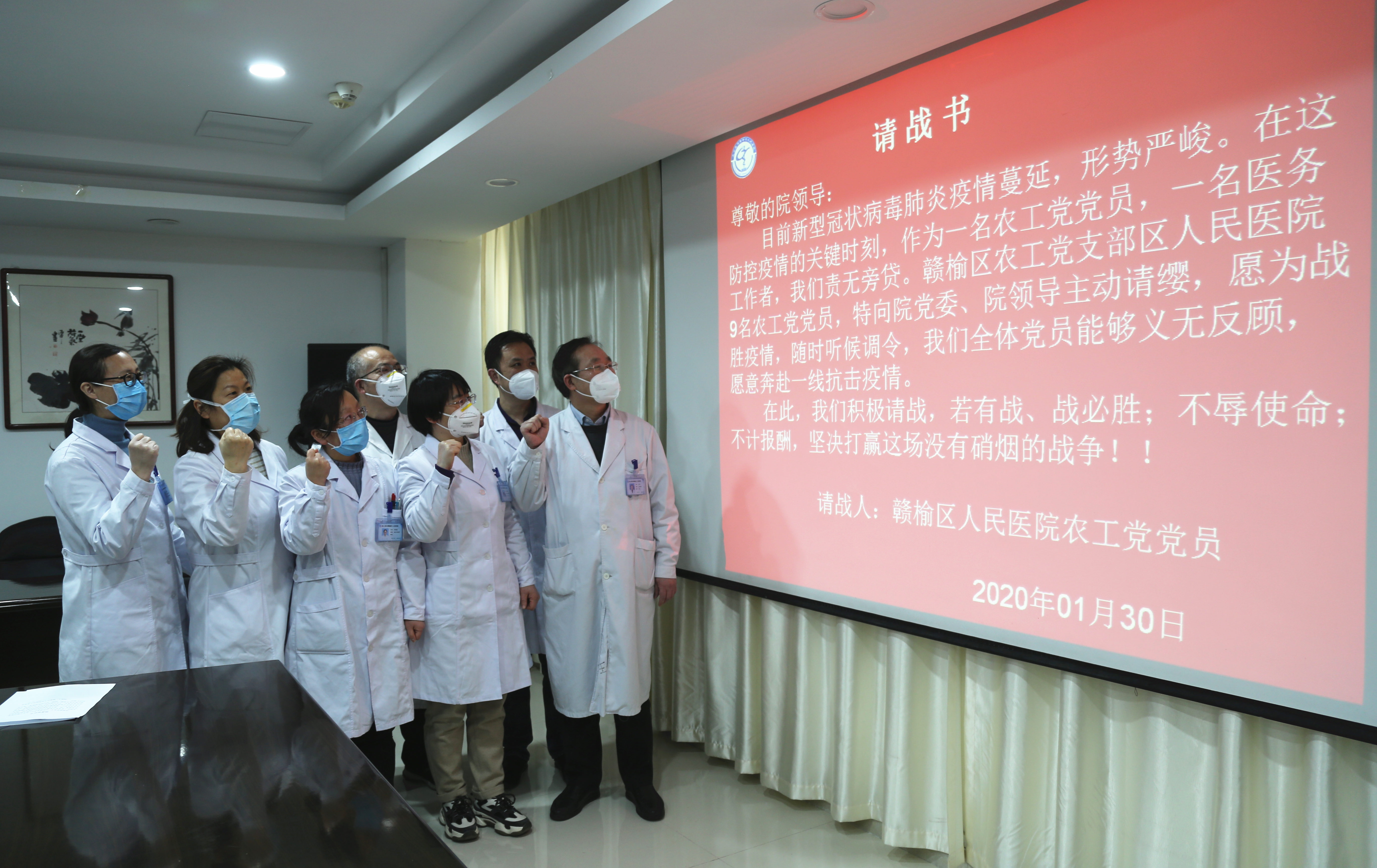 在得知赣榆区已出现新冠肺炎确诊病例后,姜守信、王宗山、滕培兰、郑海建、张宜波、张善红、李萍、孙运祥、陈新新等9名农工党员主动请缨,郑重向医院党委请战,申请加入抗击新型冠状病毒疫情的队伍。农工党员们面向请战书宣誓,并一致表示:“愿为战胜疫情随时听候调令,服从医院工作安排,我们责无旁贷!”