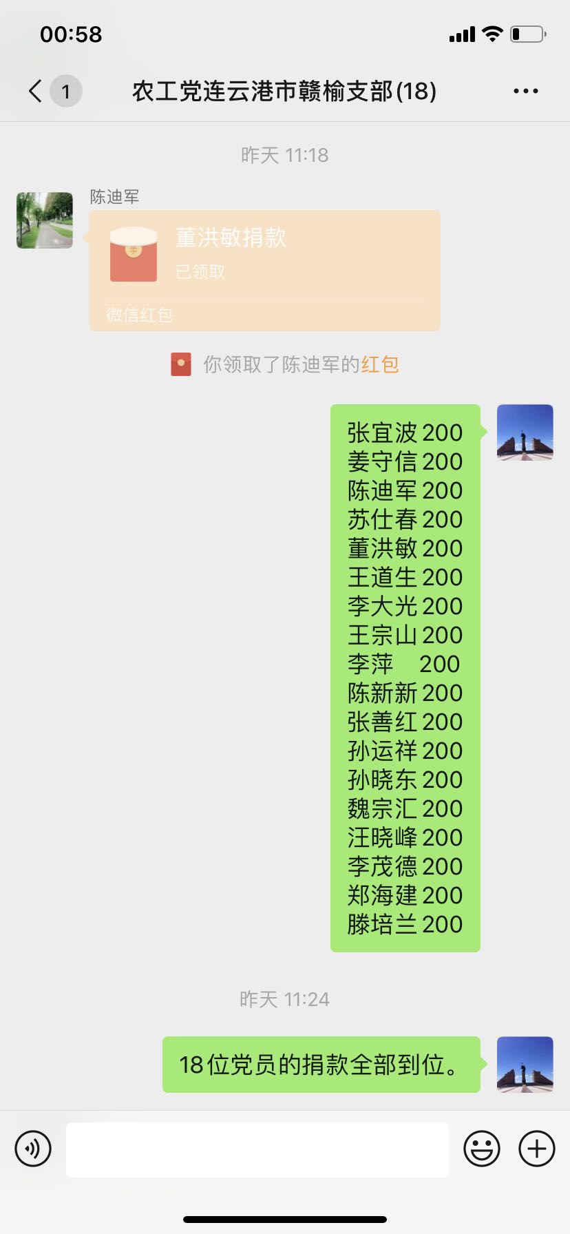 同时,一场接龙捐款在党员微信群里进行着,党员们纷纷献出了自己的爱心。